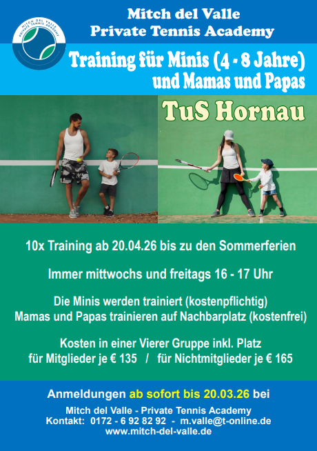 Ein rundum gelungenes Event für die TuS Hornau . Auch im nächsten Jahr ist eine Fortsetzung der Stadtmeisterschaften geplant , sowie kleinere Turniere im kommenden Winter und noch weitere Ideen vom Abteilungsleiter Mitch del Valle um die Abteilung Tennis zu beleben .